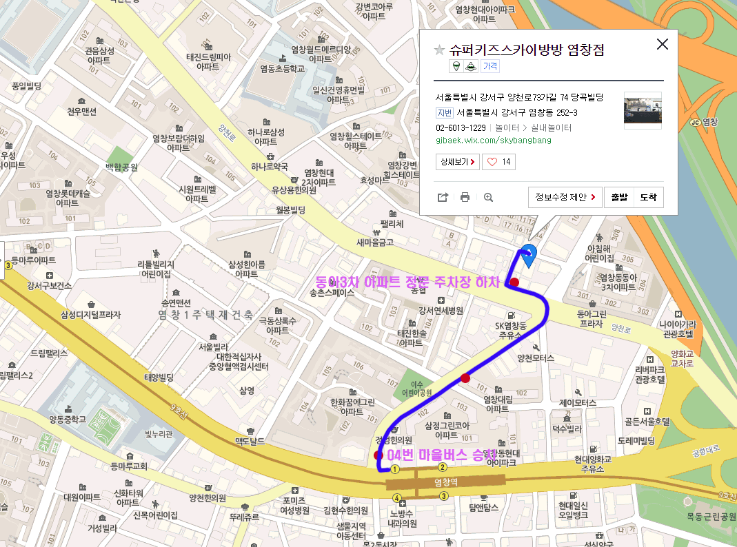 염창역 1번출구에서 04번 마을버스 탑승후 동아3차아파트 정류장에서 하차
